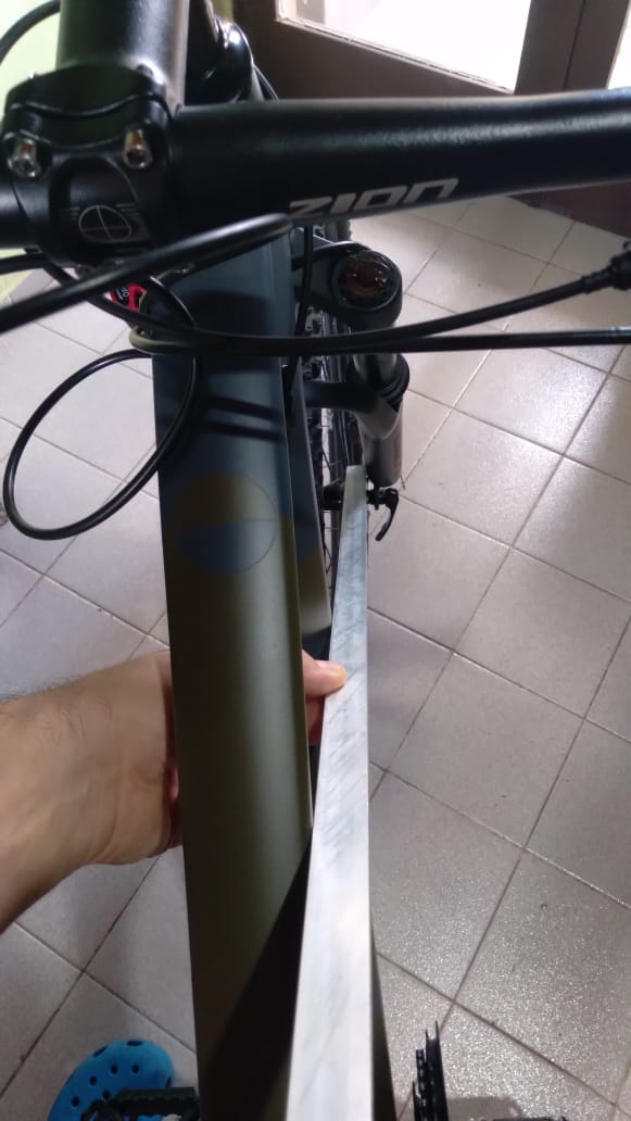 Compré mi primer bicicleta 29" hace poco y noté que la rueda estaba muy hacia la derecha, visto subido a la bici. Viendo mas detenidamente y con ayuda de una regla veo que la horquilla esta ladeada, hacia el lado opuesto de donde va el freno, y al girar el manubrio 180° se mantiene hacia el mismo lado, por lo que concluyo que el problema esta en el cuadro.