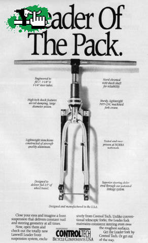 Se acuerdan de esta horquilla???es la Lawwill Leader!!!mucha historia junta en una horquilla, donde en esos momentos se probaba en desarrolar la horquilla perfecta para los inicios del mountain bike con suspencion.La Leader poseia un amortiguador hidraulico en la parte superior y el famoso sistema Lawwill de paralelogramo ya impuesto por esta marca en muchas Harley años atras y luego probado y desarrolado por Schwinn Straight y Yeti en los 90.